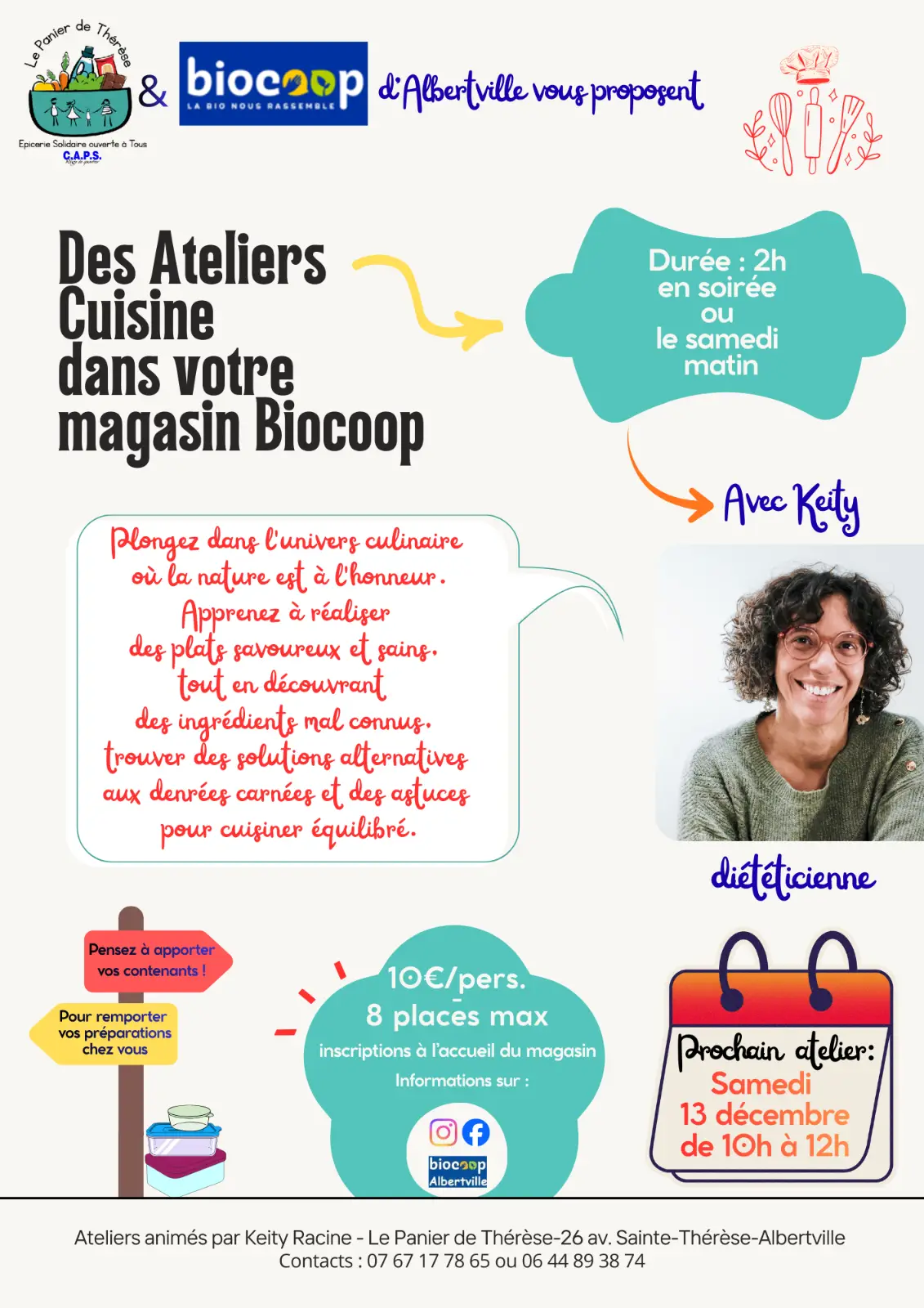 Ce Samedi 13 Décembre, l'épicerie solidaire "Le Panier de Thérèse" vous invite à participer à son atelier cuisine de 10h à 12h, sur la zone cuisine de la Biocoop d'Albertville.