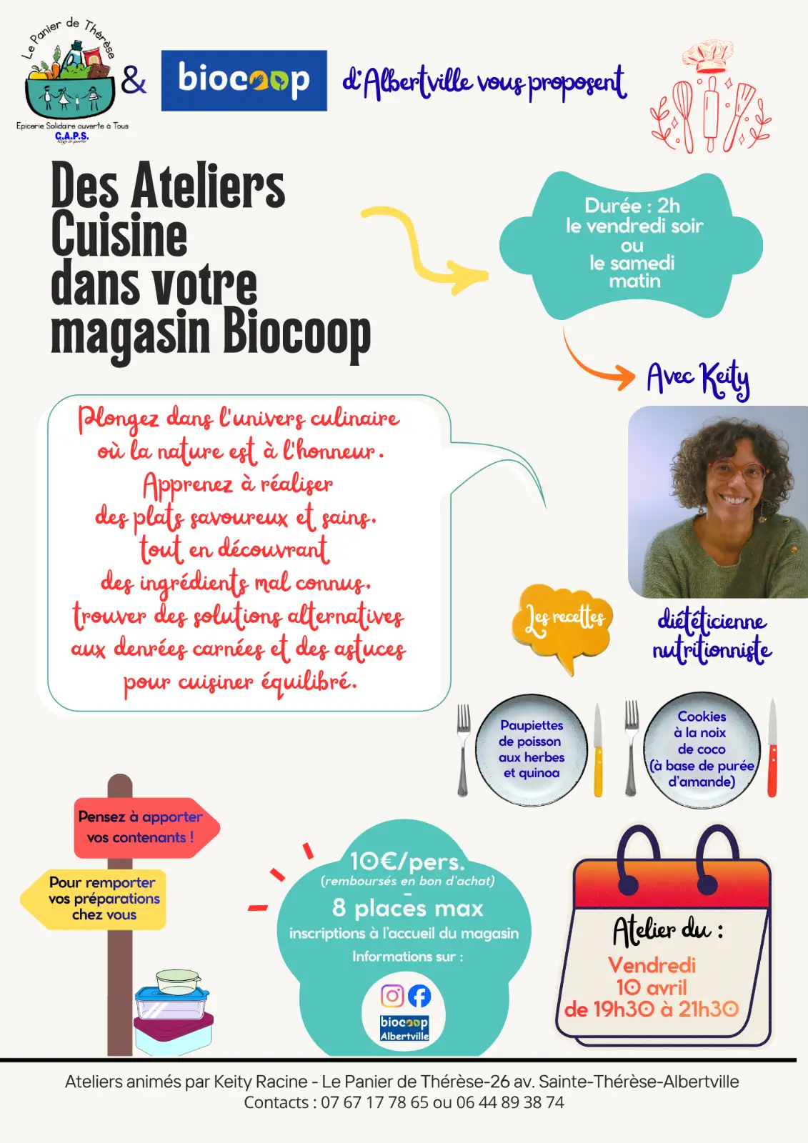 Ce Vendredi 10 Avril, l'épicerie solidaire "Le Panier de Thérèse" vous invite à participer à son atelier cuisine de 19h30 à 21h30, sur la zone cuisine de la Biocoop d'Albertville.